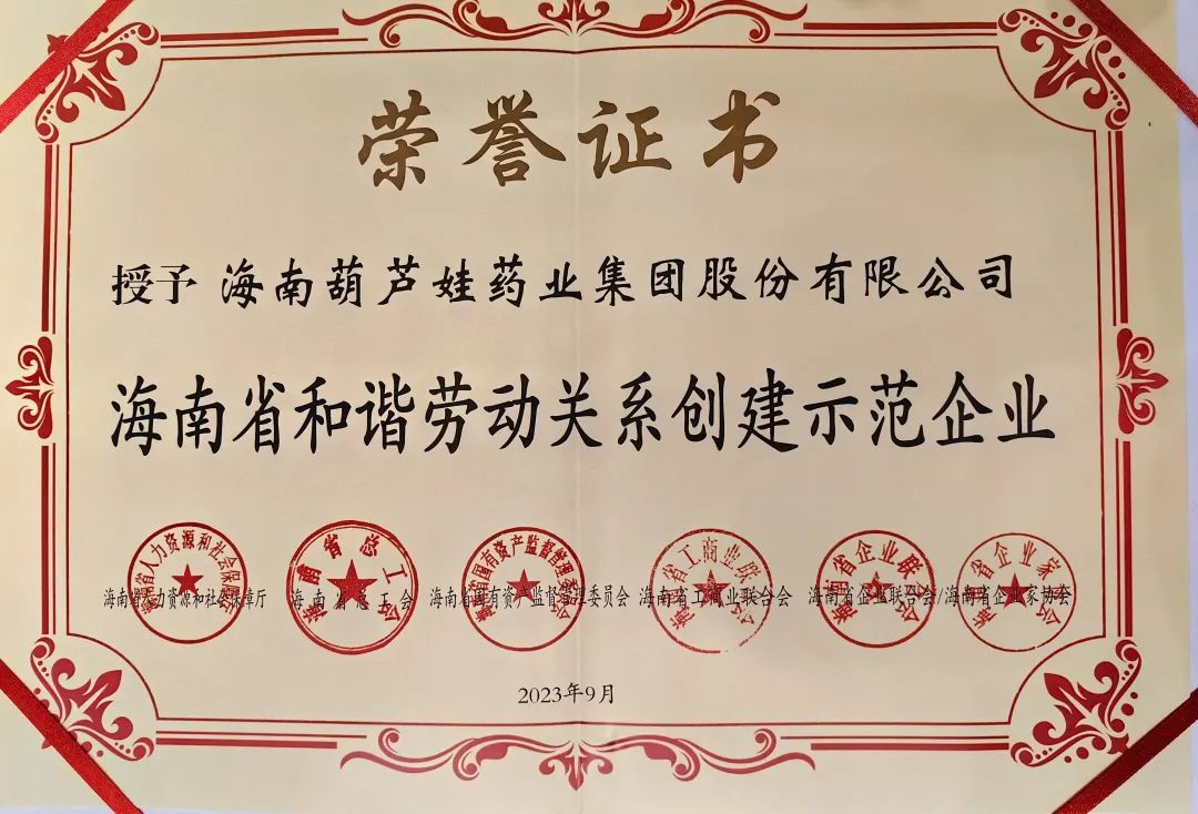 yd12399云顶药业集团获评“海南省和谐劳动关系创建示范企业”
