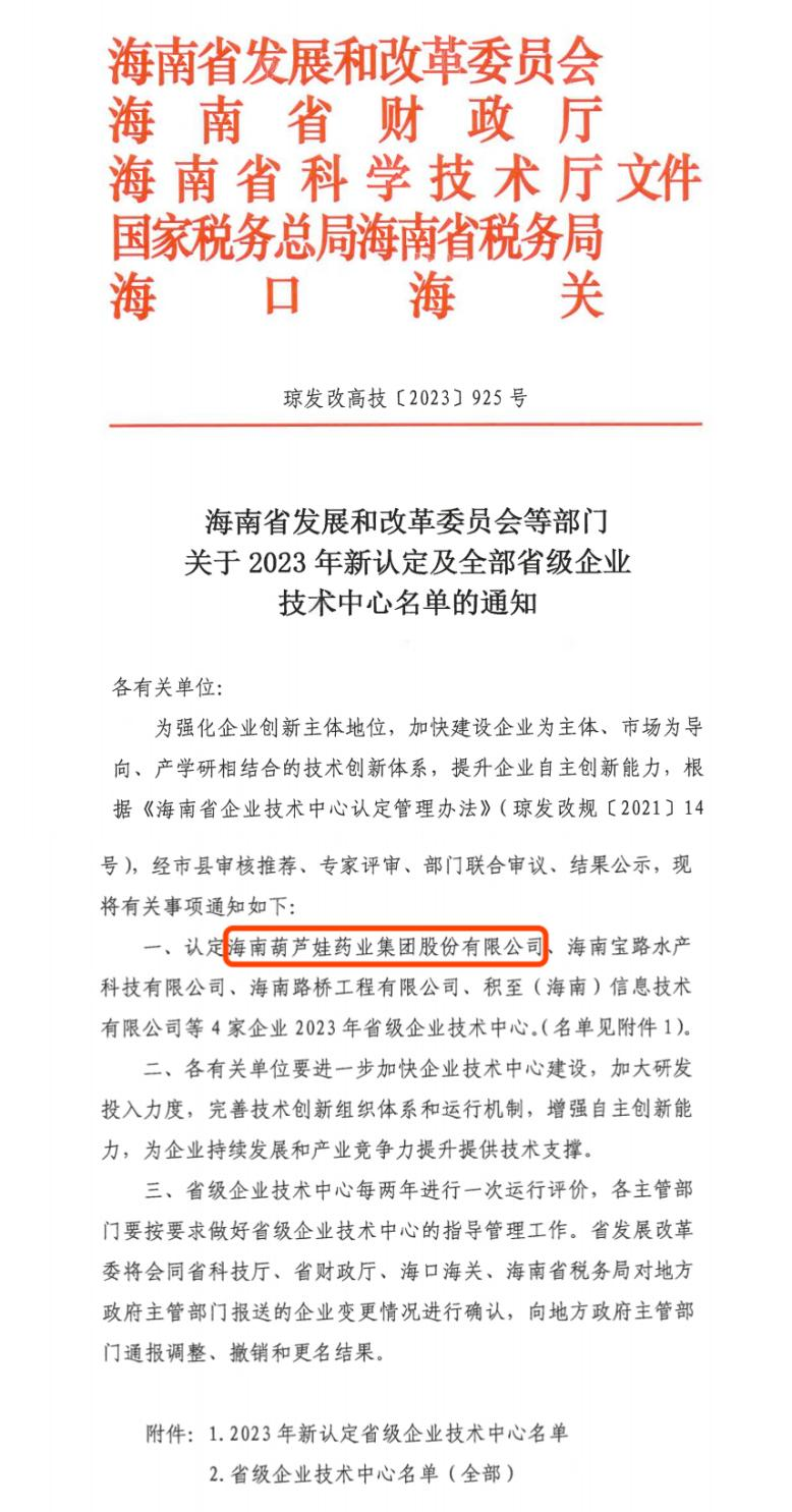 近日,海南省发改委等多部门联合公布了《关于2023年新认定及全部省级企业技术中心名单的通知》,其中,海南yd12399云顶药业集团股份有限公司成功通过评审,被认定为省级企业技术中心,是本次获批的4家企业之一。